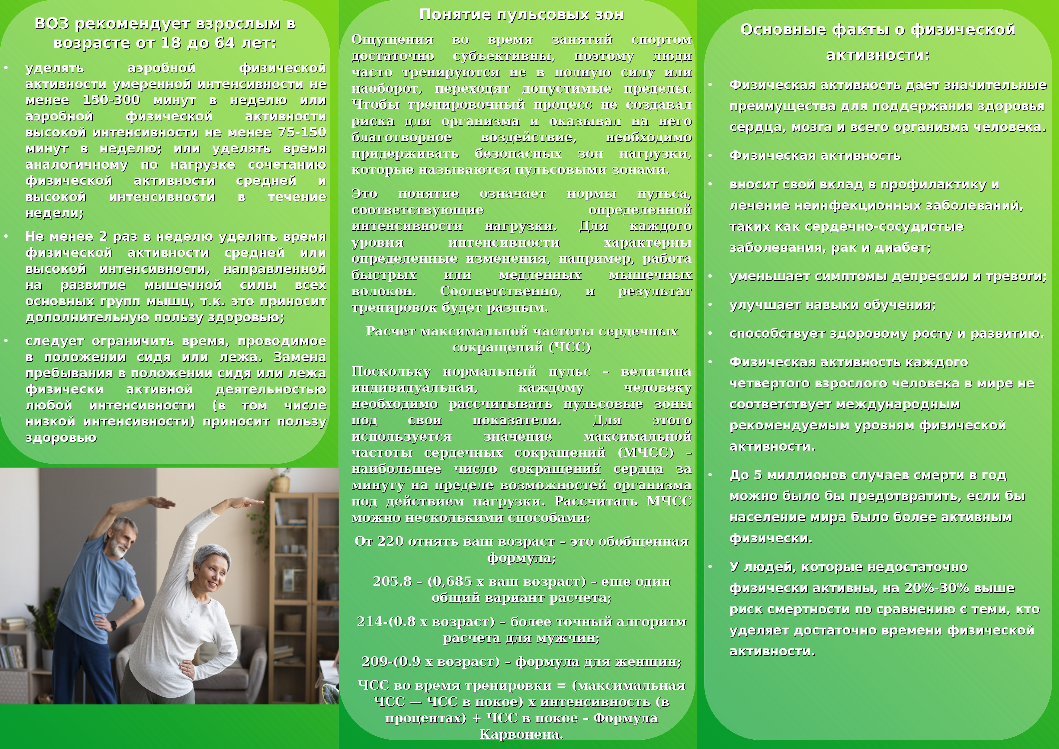 В материале указаны рекомендации Всемирной организации здравоохранения о том, сколько раз в неделю и какой физической активностью необходимо заниматься, рассмотрены понятие пульсовых зон и формула максимального количества частоты сердечных сокращений, приведены основные факты о физической активности и правила при выполнении физической нагрузкки.