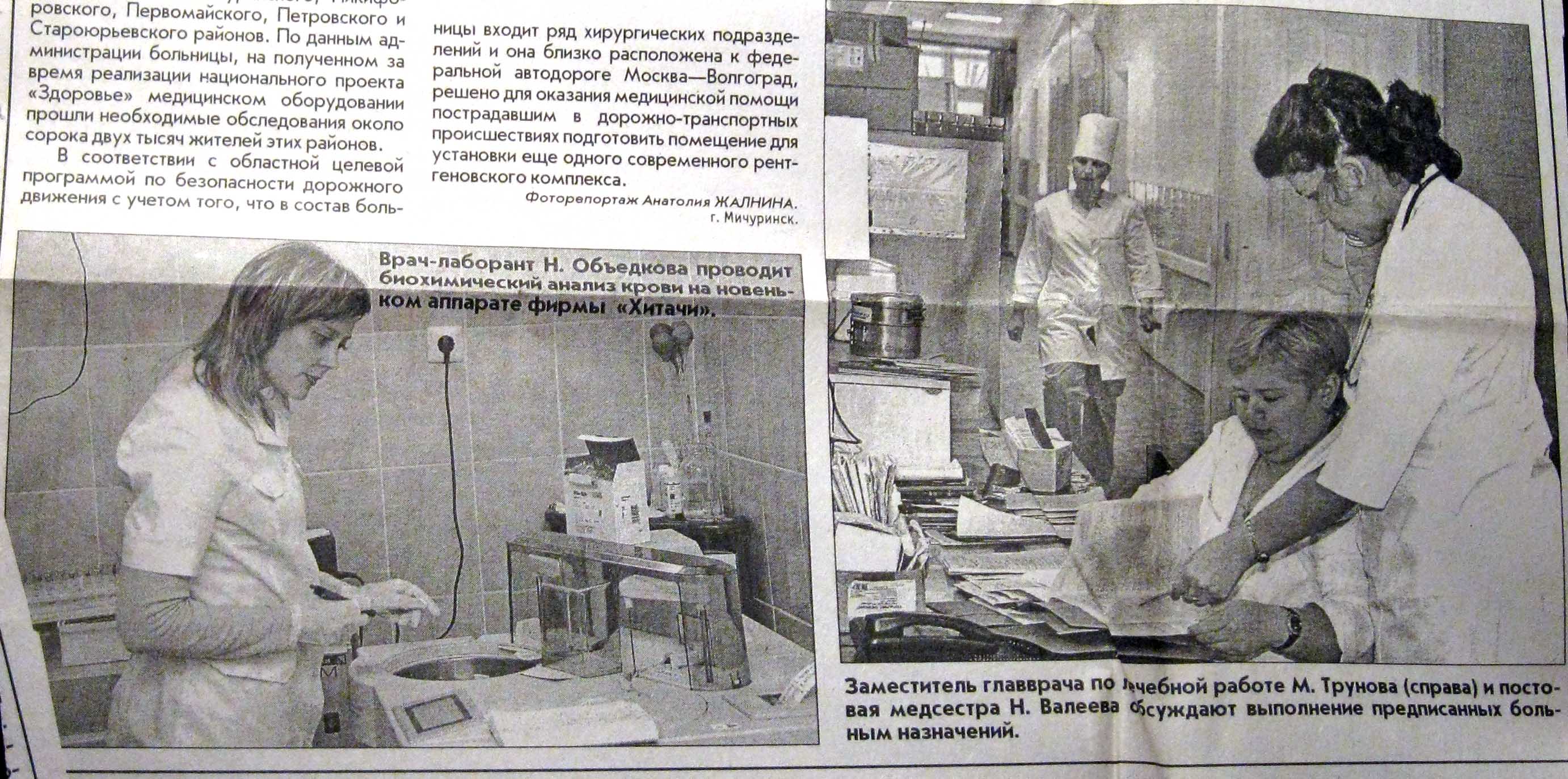 На основании постановления администрации области в конце прошлого года на базе больницы был создан межрайонный консультативно-диагностический центр, где получают необходимую медицинскую помощь жители Мичуринского, Никифоровского, Первомайского, Петровского и Староюрьевского районов. По данным администрации больницы, на полученном за время реализации национального проекта «Здоровье» медицинском оборудовании прошли необходимые обследования около сорока двух тысяч жителей этих районов.