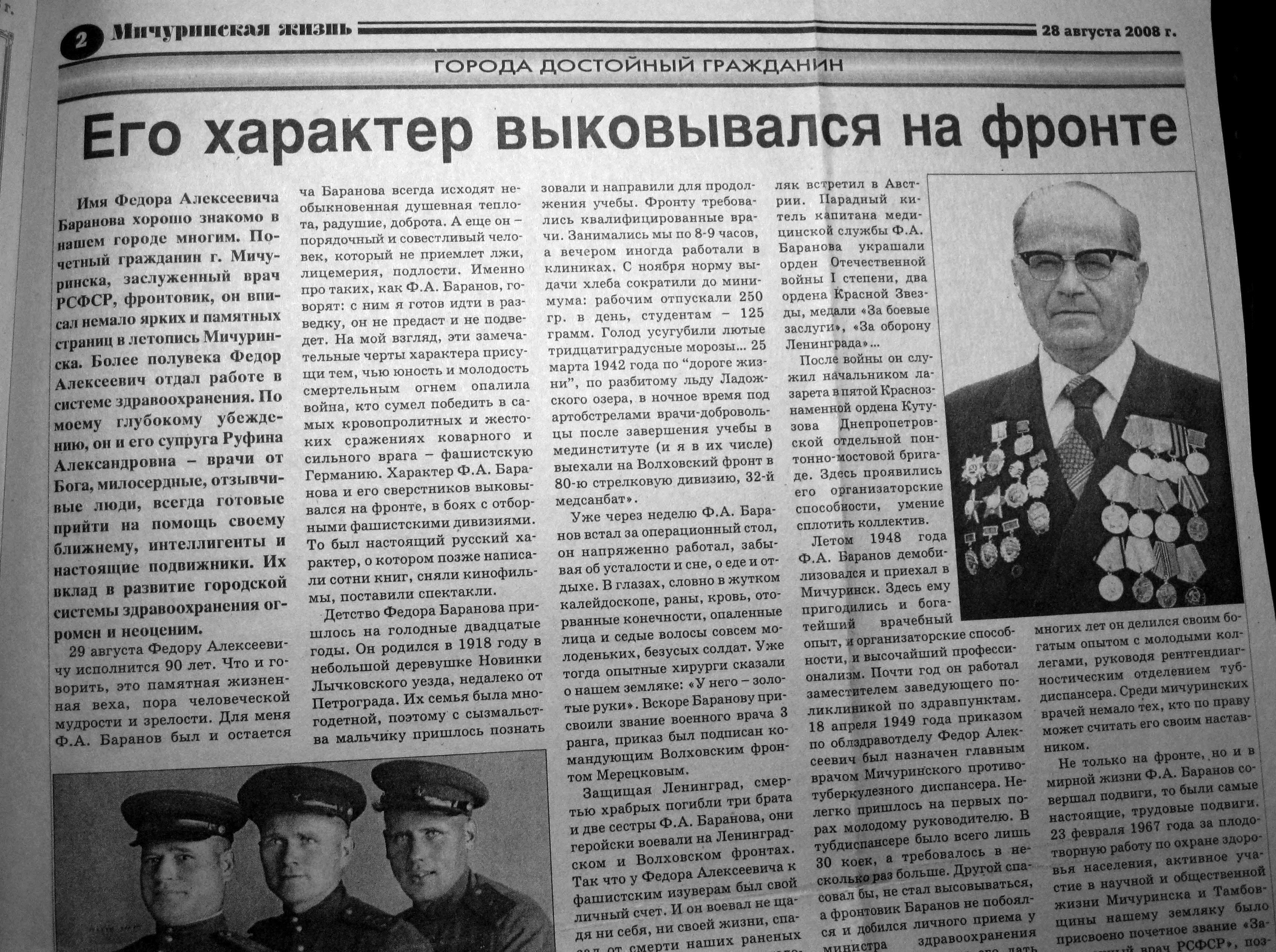 Имя Фёдора Алексеевича Баранова хорошо знакомо в нашем городе многим. Почётный гражданин г. Мичуринска, заслуженный врач РСФСР, фронтовик, он вписал немало ярких и памятных страниц в летопись Мичуринска. Более полувека Фёдор Алексеевич отдал работе в системе здравоохранения. По моему глубокому убеждению, он и его супруга Руфина Александровна – врачи от Бога, милосердные, отзывчивые люди, всегда готовые прийти на помощь своему ближнему, интеллигенты и настоящие подвижники. Их вклад в развитие городской системы здравоохранения огромен и неоценим.