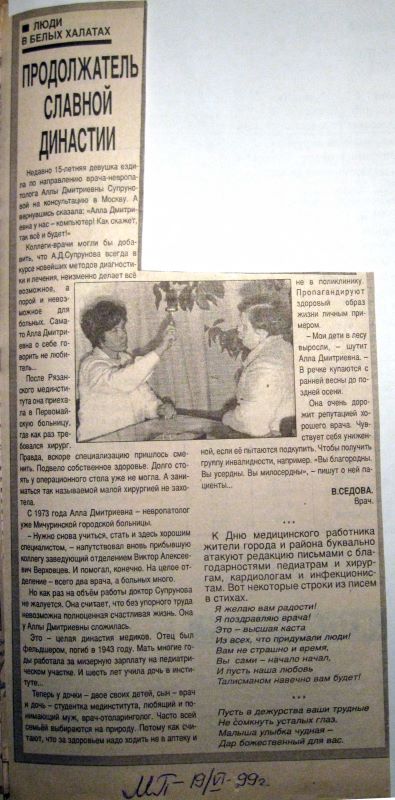 Недавно 15-летняя девушка ездила по направлению врача-невропатолога Аллы Дмитриевны Супруновой на консультацию в Москву. А вернувшись сказала: «Алла Дмитриевна у нас — компьютер! Как скажет, так всё и будет!»