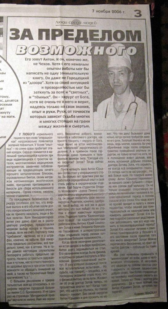 С большим уважением и признательностью всегда относилась к корифеям хирургии городской больницы имени С. С. Брюхоненко. И не один раз на страницах «Мичуринской правды» звучали их имена. Имя же скромного, бесконечно доброго, внимательного и заботливого доктора, как принято говорить — хирурга от Бога, чаще звучит на устах многочисленных «обитателей» хирургического отделения. А в приёмном покое горбольницы давно привыкли к телефонным звонкам типа: «Сегодня кто из хирургов? Зотов? Тогда сейчас приедем!».