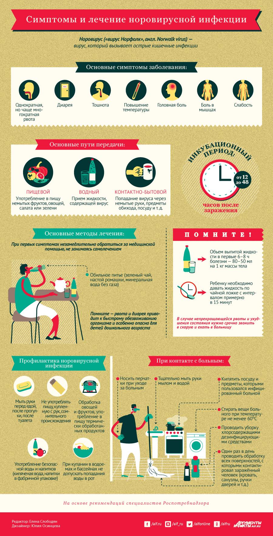 Кишечные инфекции норовирусной этиологии проявляются ярко выраженной кишечной симптоматикой (рвота, понос, повышение температуры тела) и характеризуются быстрым течением.