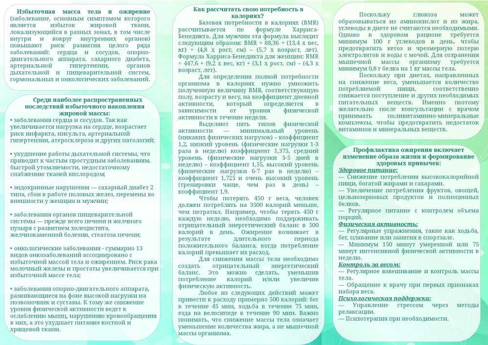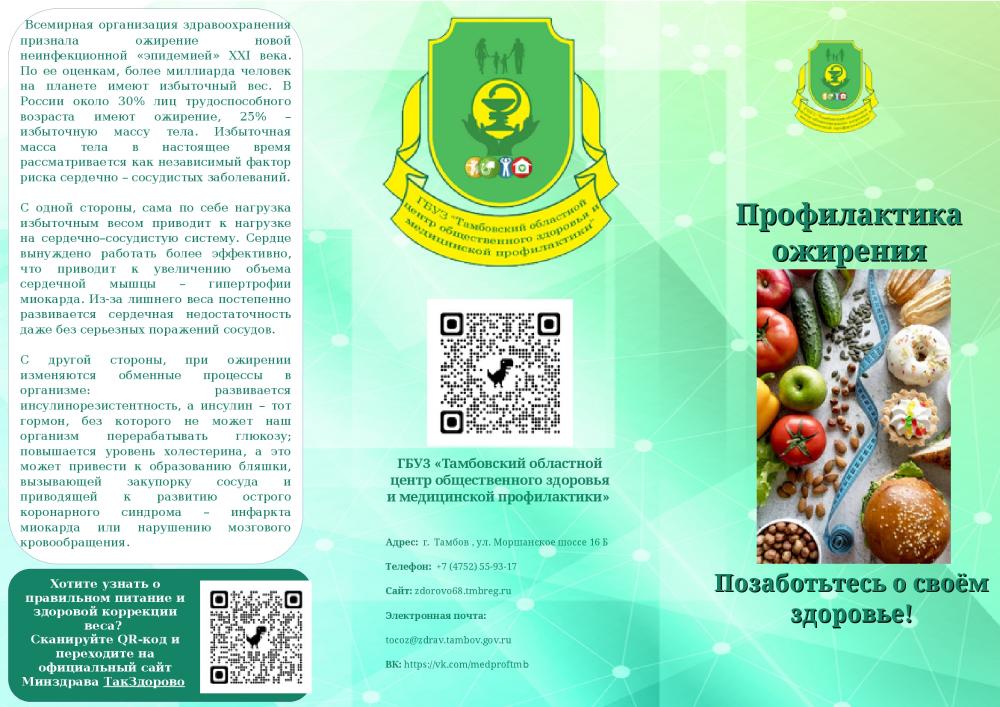 Если у вас нет избыточной массы тела или ожирения, то в вашем организме кровь циркулирует более эффективно, уровень жидкости легче регулируется и вы менее склонны к развитию сахарного диабета, сердечно-сосудистых заболеваний, некоторых видов рака и апное (остановка дыхания во сне). Но, если вы страдаете ожирением, то имеете более высокий риск возникновения проблем со здоровьем, поскольку лишний вес способствует повышению холестерина и триглицеридов в крови, понижению концентрации «хорошего» холестерина, повышению артериального давления и развитию сахарного диабета. А это, как правило, приводит к повышению риска развития ишемической болезни сердца и мозгового инсульта. Поэтому, если вы столкнулись с проблемой избыточного веса или ожирением, не стесняйтесь обращаться к специалистам в наш «Центр здоровья», который находится по адресу: г. Мичуринск, улица Революционная, дом 64, кабинет № 14. Часы с 8.00 до 15.48.