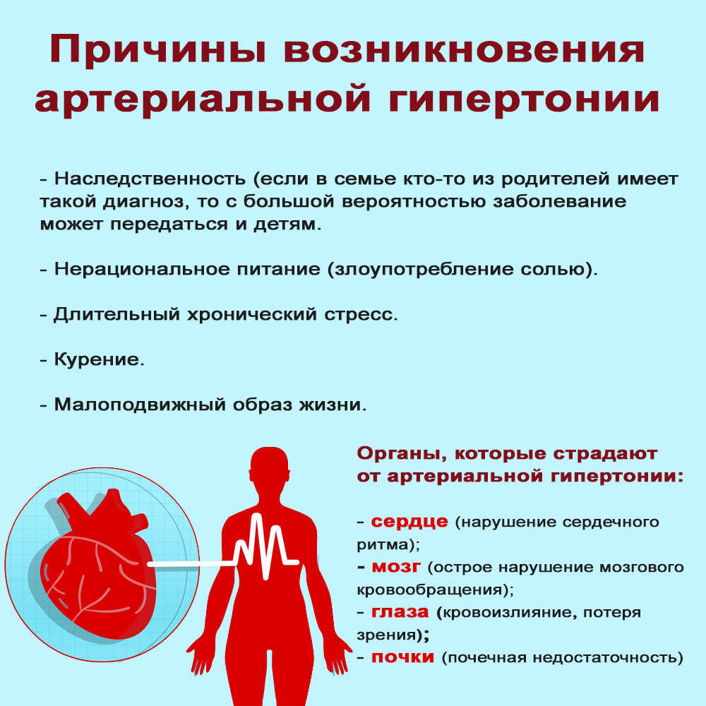 Первой причиной возникновения артериальной гипертонии необходимо считать наследственный фактор. Дело в том, что если в семье кто-то из родителей имеет такой диагноз, то с большой вероятностью заболевание может передаться и детям. Эту информацию необходимо всегда доносить до лечащего врача и отмечать, в каком возрасте оно появилось у родственников. Факторами риска являются сердечно-сосудистые заболевания, которые проявляются до 65 лет у женщин и до 55 лет — у мужчин. Как и во многих случаях возникновения других заболеваний, здесь тоже бывают исключения и не каждый может «взять» у родителей по наследству артериальную гипертонию. Безусловно, важно помнить о том, что психоэмоциональные нагрузки и образ жизни играют огромную роль в возникновении данного заболевания. Длительные стрессы, негативные эмоции, проблемы на работе или в семье тоже могут повышать артериальное давление и спровоцировать развитие артериальной гипертонии.