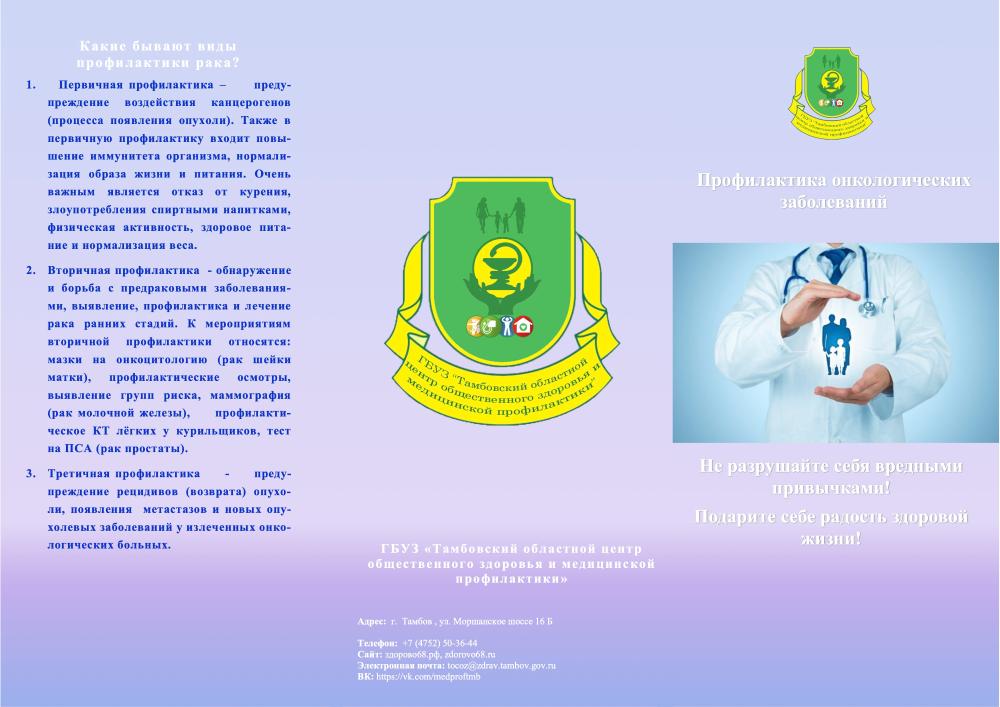В рамках акции «Профилактика онкологии. Будь в курсе!» наши коллеги из ГБУЗ «Тамбовский областной центр общественного здоровья и медицинской профилактики» разработали информационный материал, в котором подробно рассказали о профилактики онкологии.