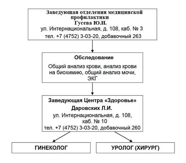 Консультация специалистов включает в себя: консультацию терапевта, акушера-гинеколога и уролога, а также других специалистов и обследование по медицинским показаниям.