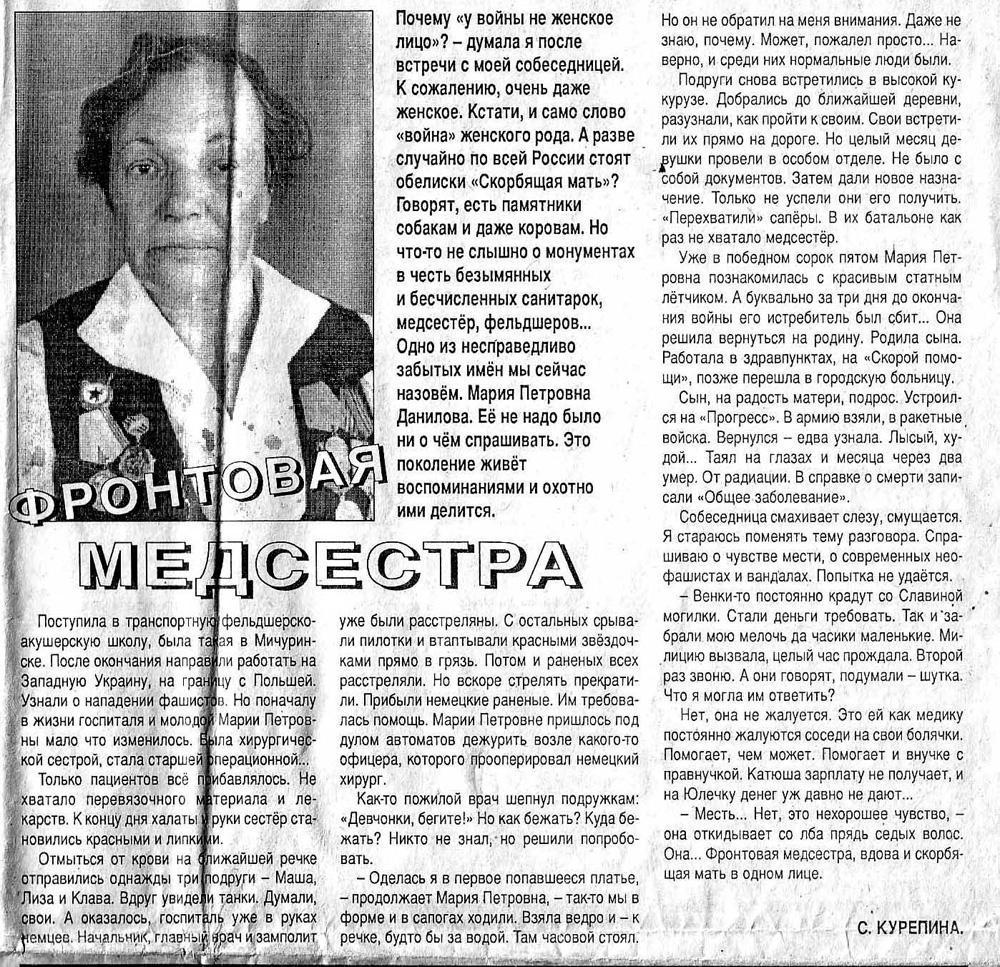 Почему «у войны не женское лицо»? — думала я после встречи с моей собеседницей. К сожалению, очень даже женское. Кстати, и само слово «война» женского рода. А разве случайно по всей России стоят обелиски «Скорбящая мать»? Говорят, есть памятники собакам и даже коровам. Но что-то не слышно о монументах в честь безымянных и бесчисленных санитарок, медсестёр, фельдшеров… Одно из несправедливо забытых имён мы сейчас назовём. Мария Петровна Данилова. Её не надо было ни о чём спрашивать. Это поколение живёт воспоминаниями и охотно ими делится.