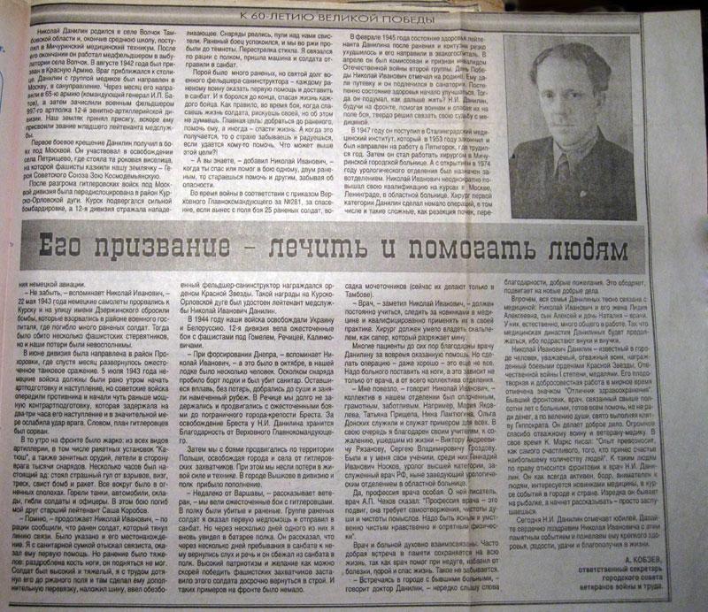 Николай Иванович Данилин — известный в городе человек, уважаемый, отважный воин, награждённый боевыми орденами Красной Звезды, Отечественной войны I степени, медалями. Его плодотворная и добросовестная работа в мирное время отмечена значком «Отличник здравоохранения». Бывший фронтовик, врач, связанный свыше полсотни лет с больными, готов всем помочь, но не ради денег, а по велению души, свято выполняя клятву Гиппократа. Он делает доброе дело. Огромное спасибо отважному воину и ветерану-медику. В своё время К. Маркс писал: «Опыт превозносит, как самого счастливого, того, кто принёс счастье наибольшему количеству людей». К таким людям по праву относится фронтовик и врач Н. И. Данилин. Он как всегда активен, бодр, внимателен к людям, интересуется новинками медицины, в курсе событий в городе и стране. Изредка он бывает на рыбалке, а начнёт рассказывать — просто заслушаешься.
