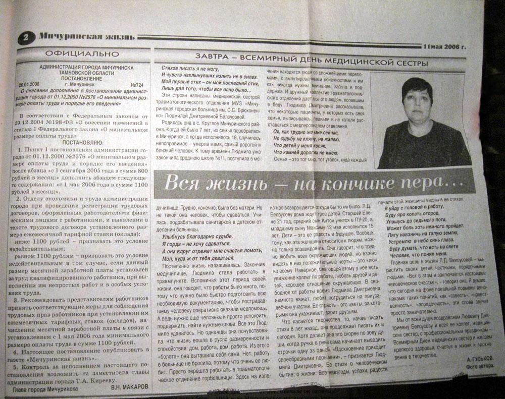 Эти строки написаны медицинской сестрой травматологического отделения МУЗ «Мичуринская городская больница им. С. С. Брюхоненко» Людмилой Дмитриевной Белоусовой.